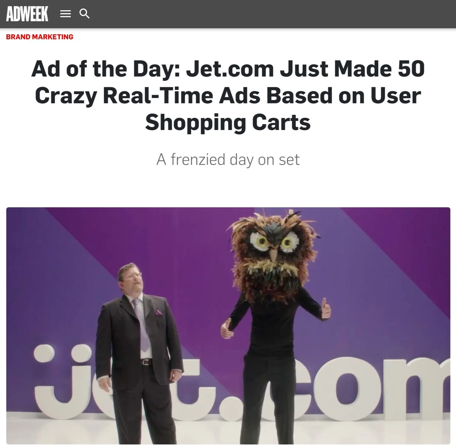 Online retailer Jet.com made its online debut with a responsive social campaign that played off the items in actual shopper's carts. 53 videos were written, shot, edited and shipped in one day.